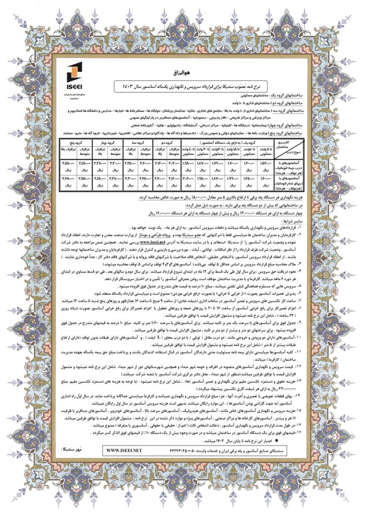 نرخ نامه سندیکای آسانسور 1403